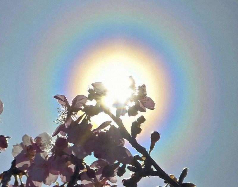 ※花粉光環とは…空気中に飛沫する花粉に太陽光が回り込むことで、光が円盤状に虹色に広がる現象のこと